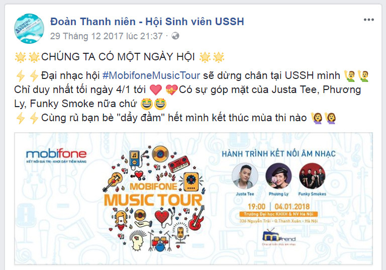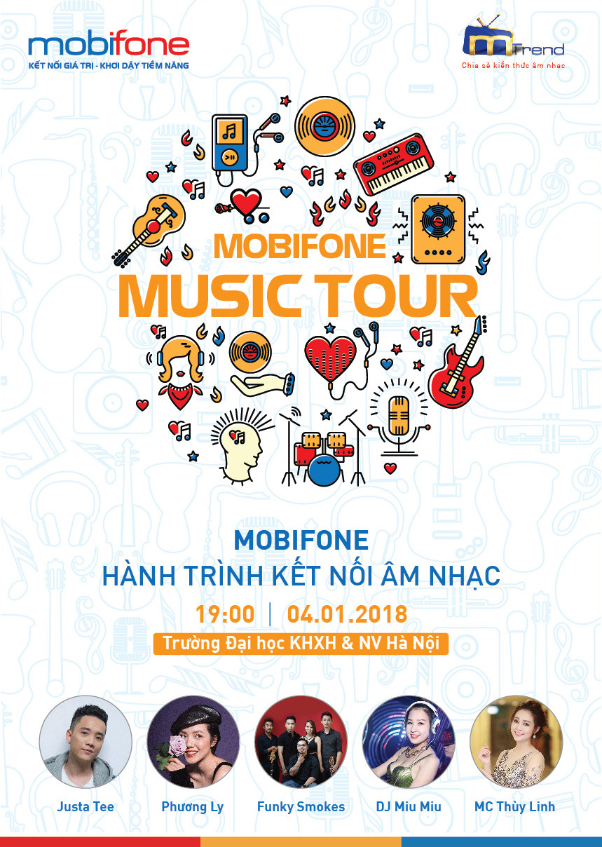 Tiếp nối thành công của các chương trình trước, chuyến xe MobiFone Music Tour - Hành trình kết nối âm nhạc sẽ tiếp tục lăn bánh tới các trường đại học trên địa bàn cả nước. Điểm dừng chân tiếp theo của chuỗi chương trình là trường Đại học KHXH & NV, Hà Nội hứa hẹn sẽ mang đến một sự khởi đầu hứng khởi cho năm 2018 ngập tràn niềm vui, năng lượng và đầy ắp sự tươi mới. Hàng nghìn sinh viên sẽ được hòa mình trong không khí sôi động cùng các ca khúc đang làm chao đảo các bảng xếp hạng trong thời gian qua của JustaTee, Phương Ly…
