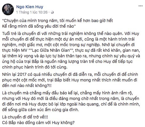 Soobin Hoàng Sơn vừa mở màn V-Pop năm 2018 với bản audio và MV Đi để trở về 2 - Chuyến đi của năm. Với ca khúc ballad mang giai điệu nhẹ nhàng, lời ca ý nghĩa do nhạc sĩ Tiên Cookie sáng tác, Soobin Hoàng Sơn truyền tải đầy đủ được cảm xúc qua giọng ca đầy trầm ấm, sâu lắng. MV ca khúc gây ấn tượng bởi những cảnh quay đẹp ở Đà Lạt, mang thông điệp về chuyến đi đặc biệt, ý nghĩa và mang lại nhiều cảm xúc nhất lại là chuyến đi để trở về gia đình.