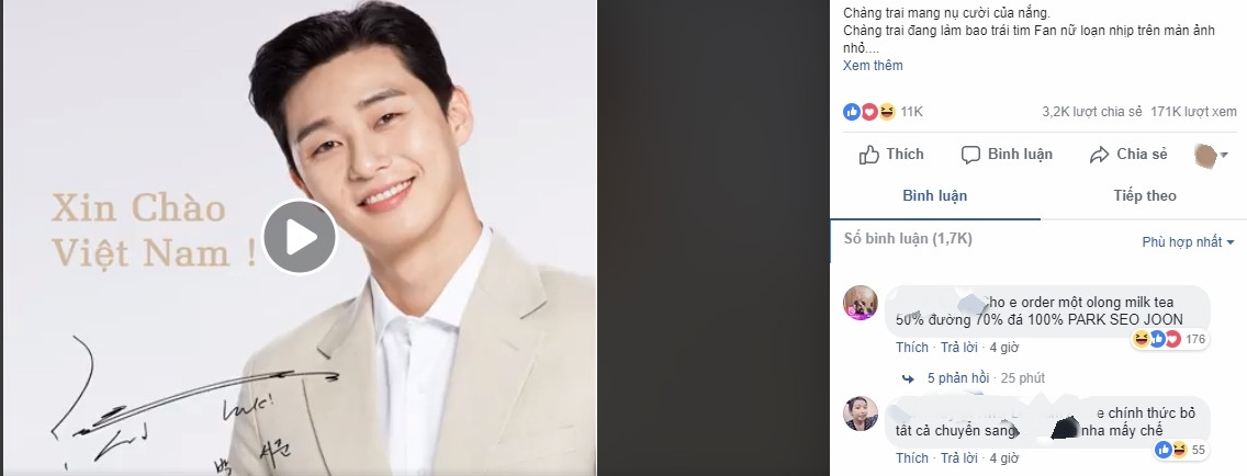 Mới đây, fanpage của một hãng trà sữa nước ngoài, có trụ sở tại Việt Nam, gây sốt cộng đồng mạng bằng bài đăng úp mở chuyện mỹ nam xứ kim chi Park Seo Joon sẽ đến Việt Nam trong mùa Hè năm nay, với vai trò gương mặt thương hiệu.