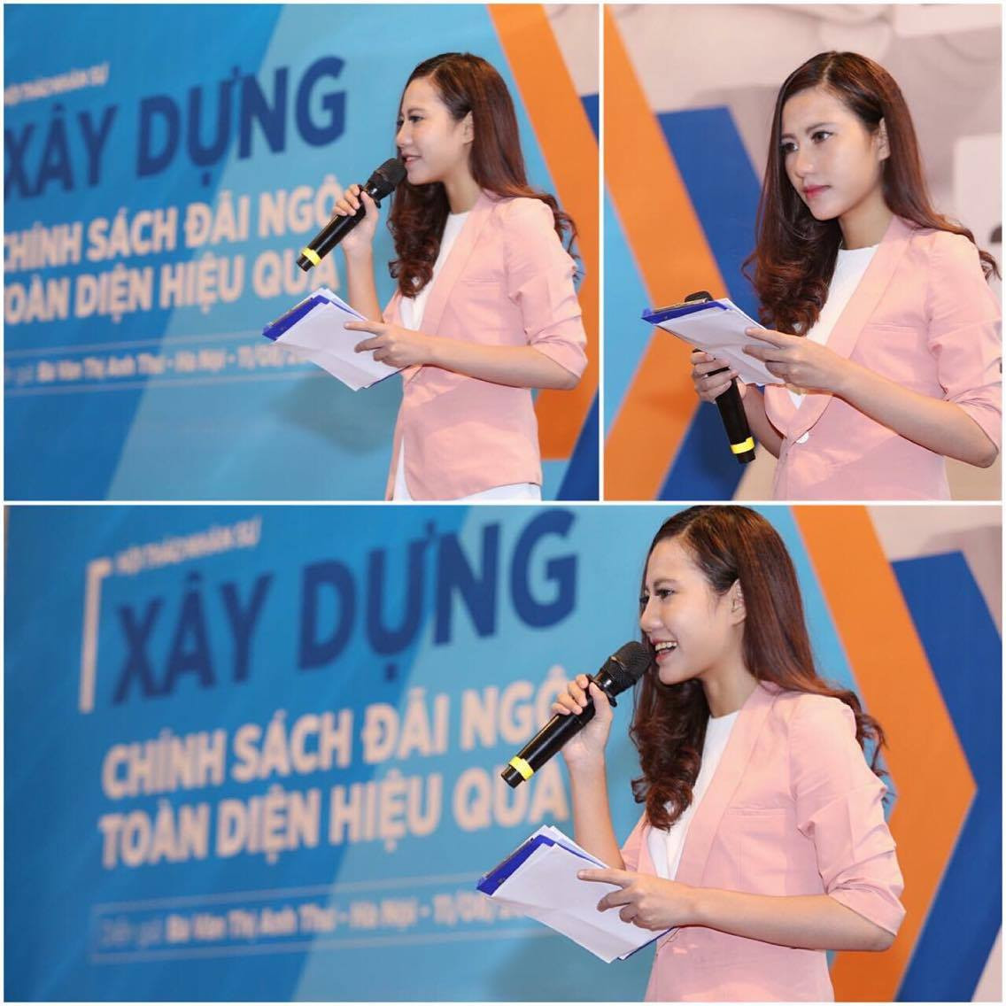 Cô MC xinh xắn trong tại buổi hội thảo tuyển dụng lao động.