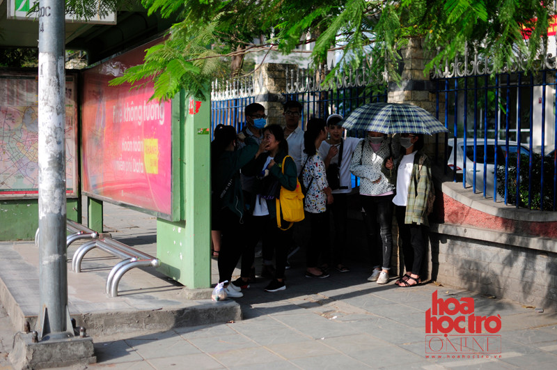 Các bạn sinh viên nấp sau nhà chờ xe bus để tránh nắng.