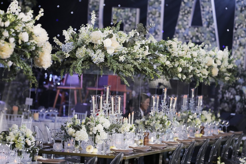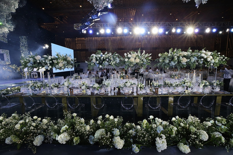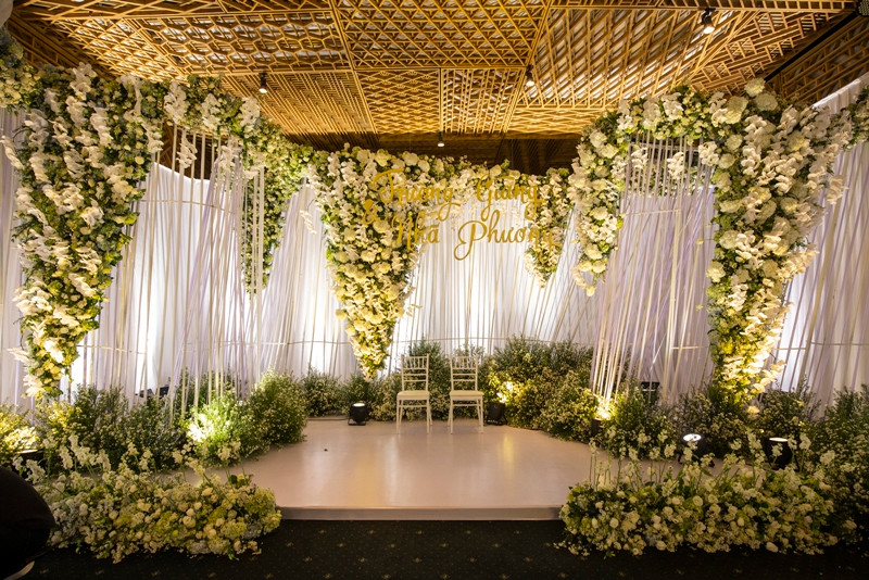 Sảnh tiệc được trang trí ngập tràn hoa tươi từ cổng hoa, khu vực chụp ảnh, bàn tiệc đến cả sân khấu.