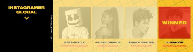 Mới đây, kênh âm nhạc MTV Latin America đã tổ chức lễ trao giải MTV Millennial Awards 2019 tại Brazil. Trước đó, trong bảng đề cử của hạng mục Nhân vật Instagram toàn cầu thì Jungkook đã được nhắc tên, bên cạnh nhiều nghệ sĩ quốc tế như Ariana Grande, Billie Eilish, Shawn Mendes, Miley Cyrus... Điều đáng nói là những ca sĩ kia đều sở hữu tài khoản Instagram chính chủ, còn Jungkook thì chỉ dùng chung một tài khoản với các thành viên khác của BTS mà thôi.