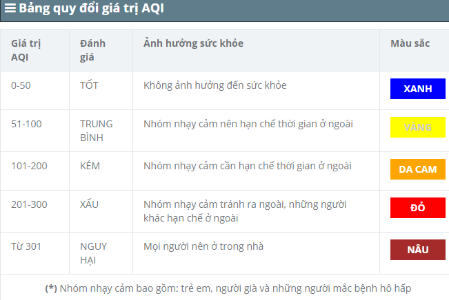 Hà Nội trước thềm Tết Nguyên đán đang bước vào những ngày ô nhiễm không khí nặng nề, chỉ số AQI có thời điểm chạm ngưỡng nguy hại, cho thấy chất lượng không khí đang ở mức tệ nhất trong năm. Theo bảng quy đổi giá trị AQI, chỉ số chất lượng không khí được chia làm 5 nhóm tương đương với 5 màu. Chỉ số từ 0 - 50 (màu xanh) là chất lượng không khí tốt. Từ 52 - 100 (vàng) là chất lượng trung bình. Từ 101 - 200 (da cam) là kém. Từ 201 - 300 (đỏ) là xấu là từ 300+ (nâu) tức là nguy hại.