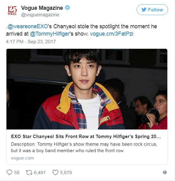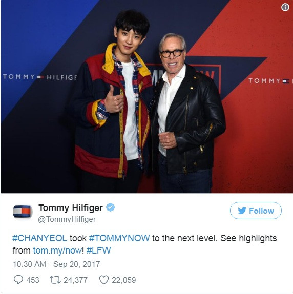 Nhà thiết kế Tommy Hilfiger cũng không quên chụp chung với Chanyeol và khoe trên tài khoản Twitter của ông, kèm theo lời khen rằng Chanyeol đã đưa trang phục của nhãn hàng Tommy Hilfiger lên một đẳng cấp khác.