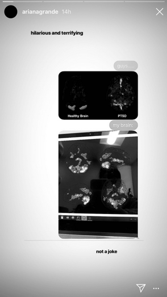 Vừa qua, Ariana Grande đã đăng tải trên Instagram Story bức ảnh kết quả siêu âm não của cô nàng khi mắc phải căn bệnh tâm lý PTSD (Rối loạn stress sau sang chấn) - căn bệnh rối loạn tâm lý sau khi trải qua tổn thương về mặt tinh thần.