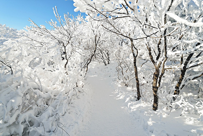 Trời nắng cũng không làm băng tuyết tan chảy do nhiệt độ xuống rất thấp. Du khách lạc giữa những con đường trekking bốn bề là tuyết trắng, ngẩng đầu lên cao là những cành cây phủ tuyết với đủ hình dáng độc đáo.
