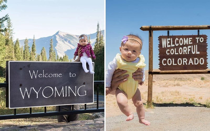 Tại mỗi chạm dừng chân, bố mẹ của Harper lại chụp ảnh bé tại tấm biển "cổng chào" của từng bang và đăng lên Instagram.