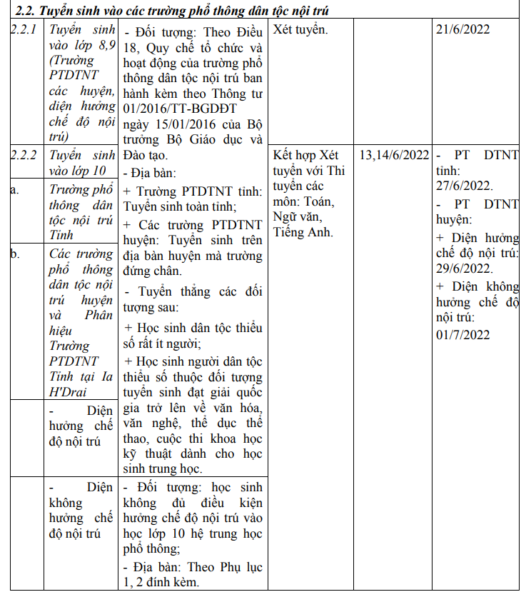 - Thời gian tuyển sinh: Giao Sở GD&ĐT hướng dẫn tổ chức đăng ký dự tuyển, thu hồ sơ, phương án xét tuyển. Thời gian hoàn thành công tác tuyển sinh trước 15/9/2022. Giao Sở GDĐT điều chỉnh lịch tuyển sinh phù hợp nếu Bộ GDĐT điều chỉnh khung kế hoạch thời gian năm học do ảnh hưởng của thiên tai, dịch bệnh... báo cáo UBND tỉnh trước khi thực hiện.