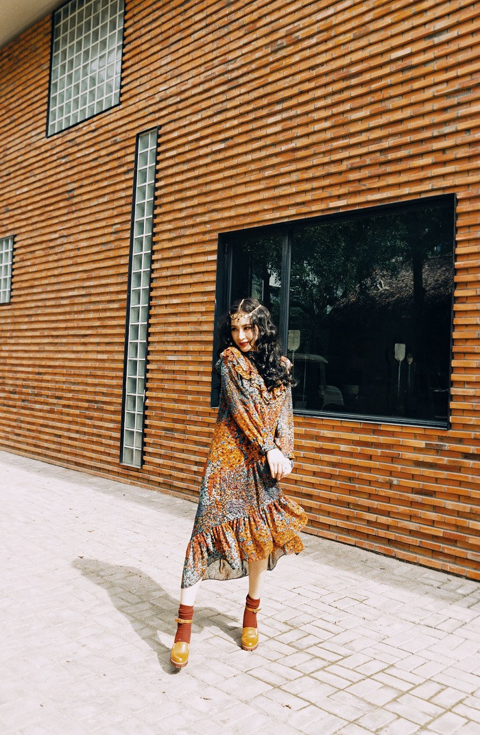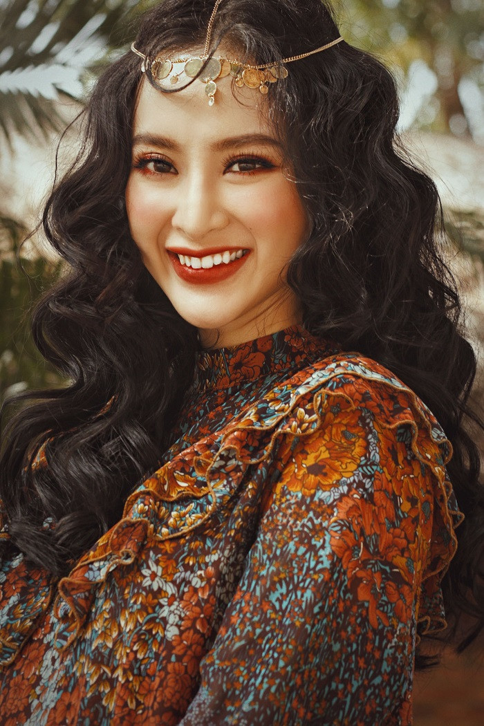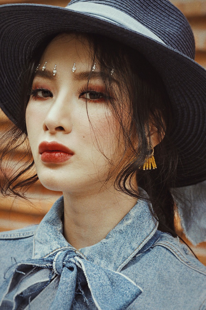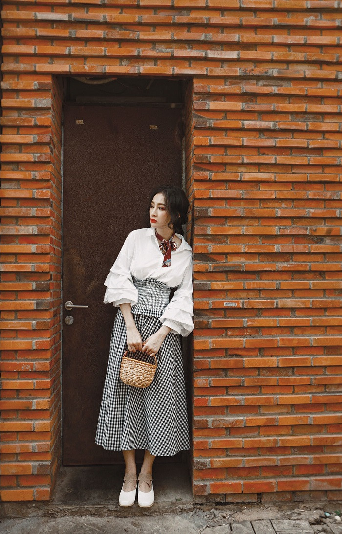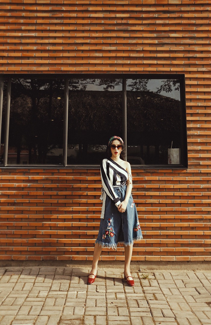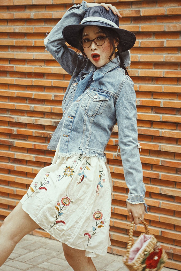 Không chỉ đóng khung mình với hình ảnh nhẹ nhàng, nữ tính, nữ diễn viên sở hữu gần 1 triệu followers trên mạng xã hội khéo léo hòa trộn một chút hippie vào phong cách countryside của mình. Chiếc áo sơ mi cách điệu được cắt một bên tay kết hợp cùng chân váy jean họa tiết hoa thêu tay là sự lựa chọn phá cách của cô và stylist. Cô còn hóa thân thành nữ cao bồi trong chiếc áo sơ mi mang chất liệu rũ cùng quần jeans ống loe.