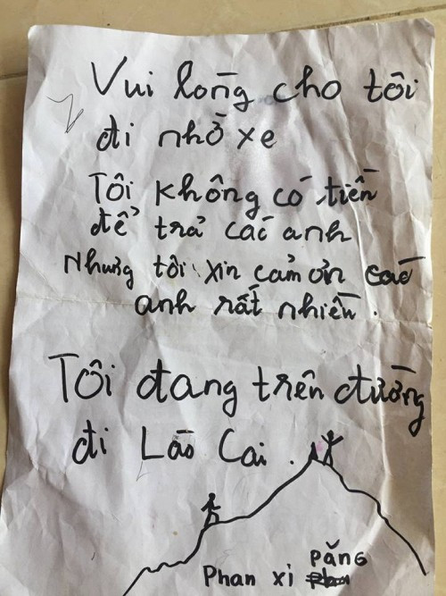 Theo lời chị T.N, người đăng tải dòng trạng thái trên cho hay: Chị tình cờ bắt gặp cô gái người nước ngoài với vẻ ủ rũ mệt mỏi ở Hà Giang, trên tay là mảnh giấy bằng tiếng Việt với nội dung: “Vui lòng cho tôi đi nhờ xe. Tôi không có tiền để trả các anh nhưng tôi xin cám ơn các anh rất nhiều. Tôi đang trên đường đi Lào Cai”.