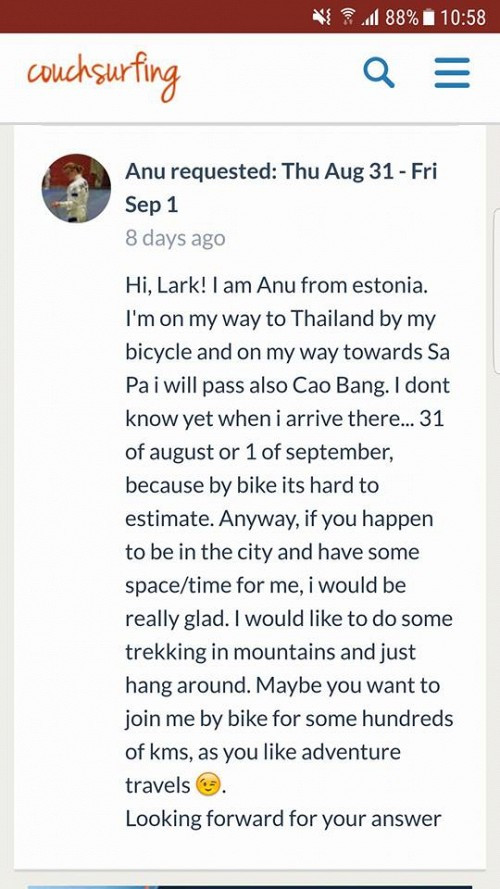 “Chào Lark, tôi là Anu đến từ Estonia. Tôi đang trên đường đến Thái Lan bằng xe đạp, đồng thời trên đường hướng đến Sapa tôi cũng ghé ngang Cao Bằng. Tôi không biết chính xác khi nào đến nơi, ngày 31/8 hay 1/9 vì rất khó để ước lượng khi đi bằng xe đạp. Dù vậy, nếu bạn có mặt ở thành phố và có thời gian hay nơi ở cho tôi, tôi sẽ rất vui…” - một phần của đoạn trao đổi với mong muốn tìm được chỗ nghỉ chân trên đường đến Fanxipan của cô gái trẻ.