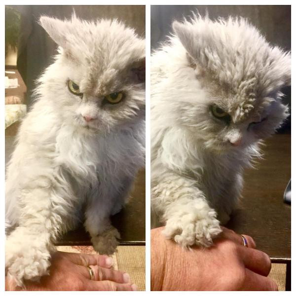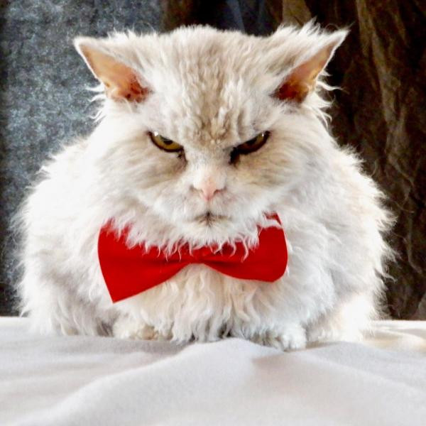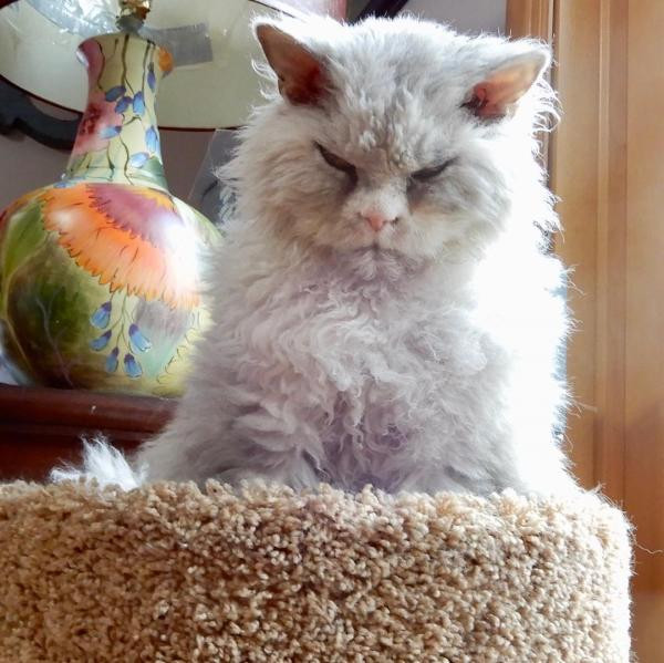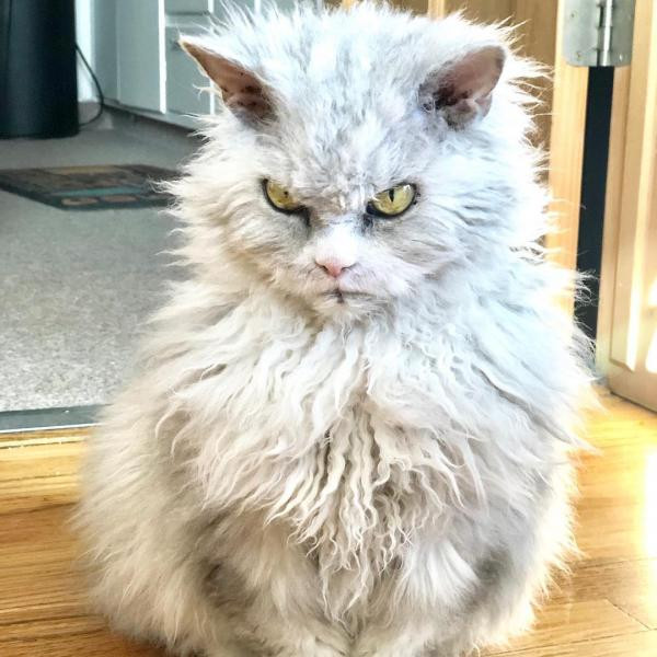 Loài mèo giống Selkirk Rex được biết đến nhờ sự thân thiện, hiền lành, dễ gần nhưng Pompous Albert lại là trường hợp ngoại lệ, ít nhất là khi nhìn vào gương mặt cáu bẳn, khó tính của nó, như đang giận giữ với cả thế giới vậy.