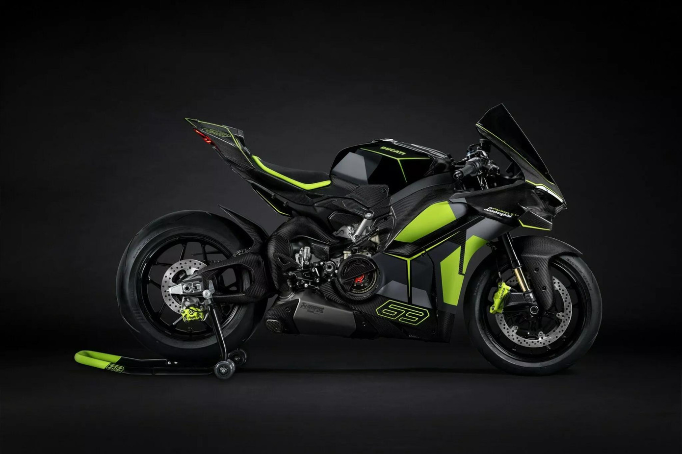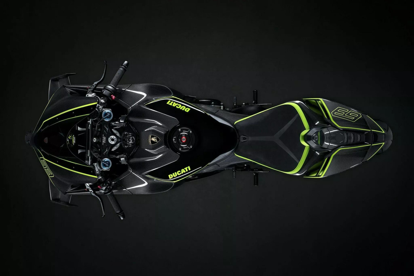 Ducati Panigale V4 Lamborghini là mẫu mô tô lấy cảm hứng từ siêu xe Revuelto. Dựa trên nền tảng Panigale V4 S, phiên bản đặc biệt này sở hữu bộ thân vỏ làm từ sợi carbon với họa tiết vân chéo giống như trên xe Lamborghini.