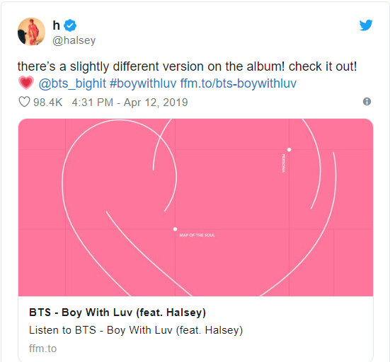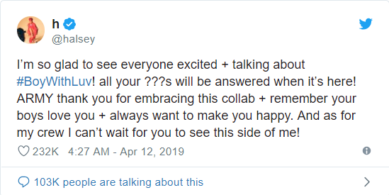 Trước khi MV Boy With Luv được phát hành, Halsey đã viết trên Twitter của cô ấy rằng: "Tôi rất vui khi thấy mọi người hào hứng và nói về Boy With Luv! A.R.M.Y, cảm ơn các bạn đã cổ vũ màn hợp tác này. Hãy nhớ rằng các chàng trai yêu các bạn và luôn muốn làm cho các bạn hạnh phúc".
