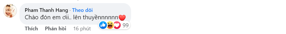 Phía dưới bài viết, siêu mẫu Thanh Hằng cũng nhanh chóng có mặt để chào đón vị huấn luyện viên cuối cùng: "Chào đón em ơi... lên thuyền".