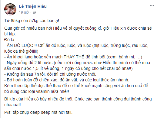 Sau khi nhiều người thắc mắc về bí kíp giảm cân trong thời gian qua, Lê Thiện Hiếu không ngần ngại chia sẻ. Theo công thức của anh thì chủ yếu kết hợp giữa việc ăn uống nghiêm ngặt và chế độ tập luyện thể dục thể thao. Anh chỉ ăn đồ luộc (thịt luộc, trứng luộc, rau luộc), ăn khoai lang, yến mạch thay cho tinh bột; ngày uống đủ 2 lít nước; tuyệt đối không ăn sau 7h tối; bỏ hoàn toàn đồ chiên xào, ăn vặt và thức ăn nhanh...