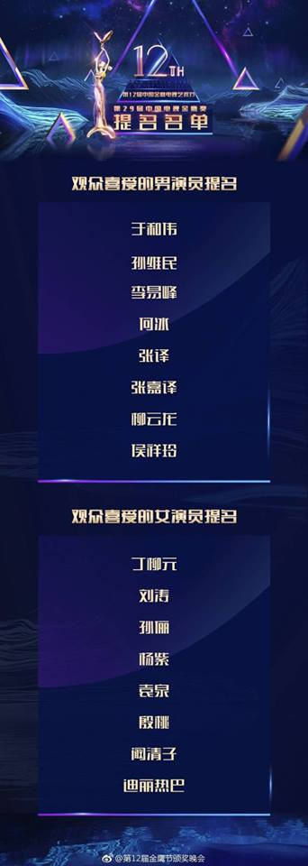 Vào ngày 1/10, đài Hồ Nam đã công bố danh sách đề cử chính thức cho hai hạng mục Nam và Nữ diễn viên xuất sắc nhất của lễ trao giải Kim Ưng 2018.