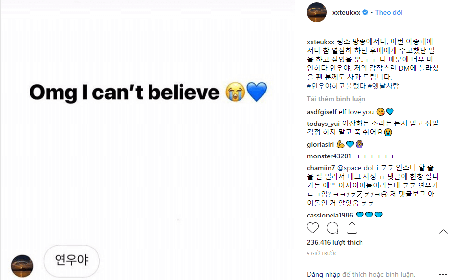 Hóa ra chẳng phải Leeteuk định "thả thính" hay gì mà anh chỉ muốn động viên Yeonwoo thôi: "Tôi chỉ muốn nói với một hậu bối rằng cô ấy đã làm việc chăm chỉ trong các chương trình. Đó là lỗi của tôi, tôi thực sự xin lỗi Yeonwoo. Tôi cũng muốn xin lỗi những người hâm mộ đã ngạc nhiên bởi DM đột ngột của tôi”.