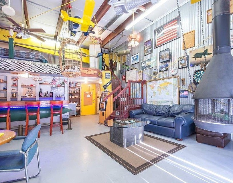 Căn hộ trong nhà chứa máy bay (Mỹ): Nằm trong một nhà chứa máy bay đang hoạt động ở Geneva, Florida, căn hộ được thiết kế theo phong cách chiết trung, là sự pha trộn giữa nhiều xu hướng, theo sở thích cá nhân trong mọi chất liệu, hình dáng, kết hợp nhưng không tạo ra “một mớ hỗn độn”. Các tiện nghi trong căn hộ bao gồm quầy bar, lò vi sóng, truyền hình vệ tinh, lò sưởi, Wi-Fi và máy lạnh.