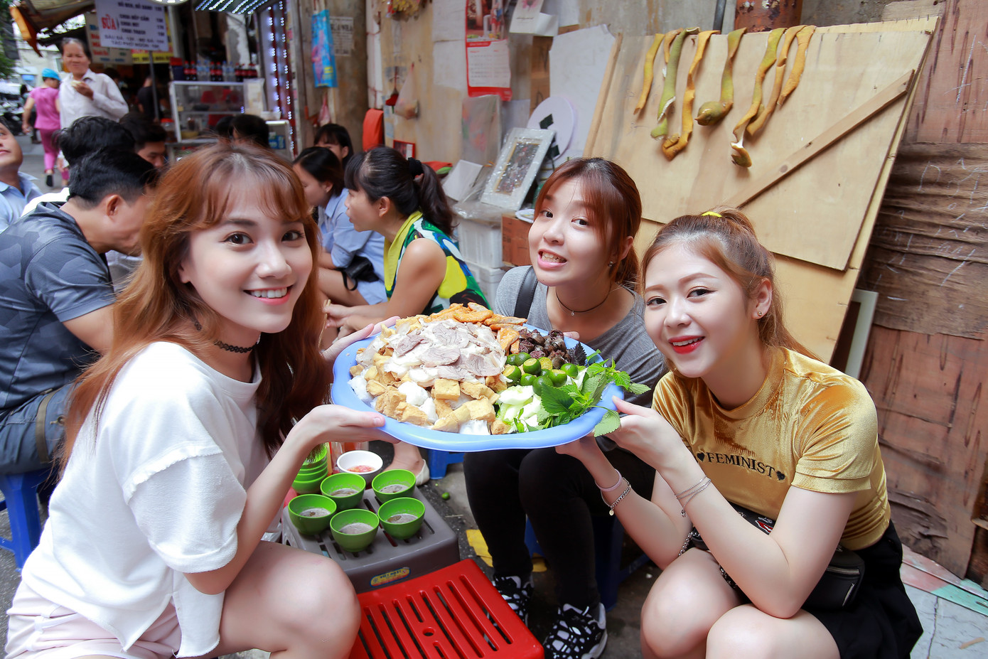 Tiếp theo, nhóm LIME đã ghé thăm hẻm ẩm thực tại phố cổ để thưởng thức món bánh đúc trứ danh tại Hà Nội. LIME chia sẻ: "Bánh đúc tại đây được giữ nóng liên tục, mềm nhuyễn, ăn chung với thịt bằm, mộc nhĩ, sốt cà, đậu hũ, rau... thật sự là không thể cưỡng nổi vị ngon".