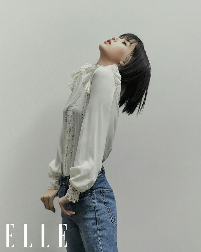 Hình ảnh Lisa trên một trong 3 phiên bản bìa ELLE Trung số tháng 12 cực kỳ đúng chuẩn siêu mẫu: Cô để tóc ngắn cá tính, khuôn mặt lạnh, cơ thể cực gầy với xương quai xanh và bờ vai nhỏ siêu đẹp.
