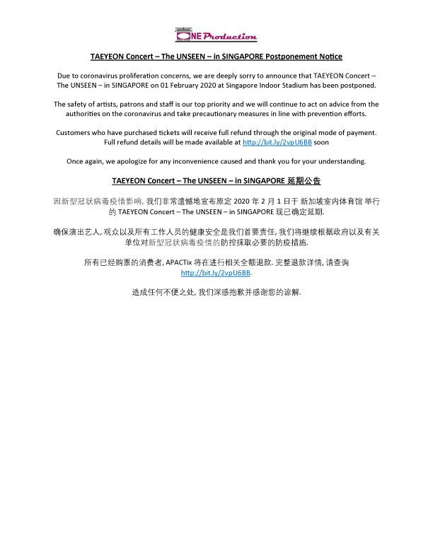Tuy nhiên, vào ngày 30/1, công ty phụ trách concert ở nước ngoài của Taeyeon đã thông báo rằng các buổi concert sắp tới của cô nàng ở Singapore sẽ bị hoãn lại do những lo ngại trước mối đe dọa đến từ virus Corona.