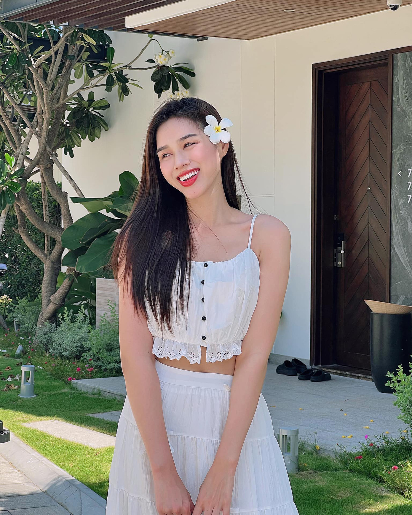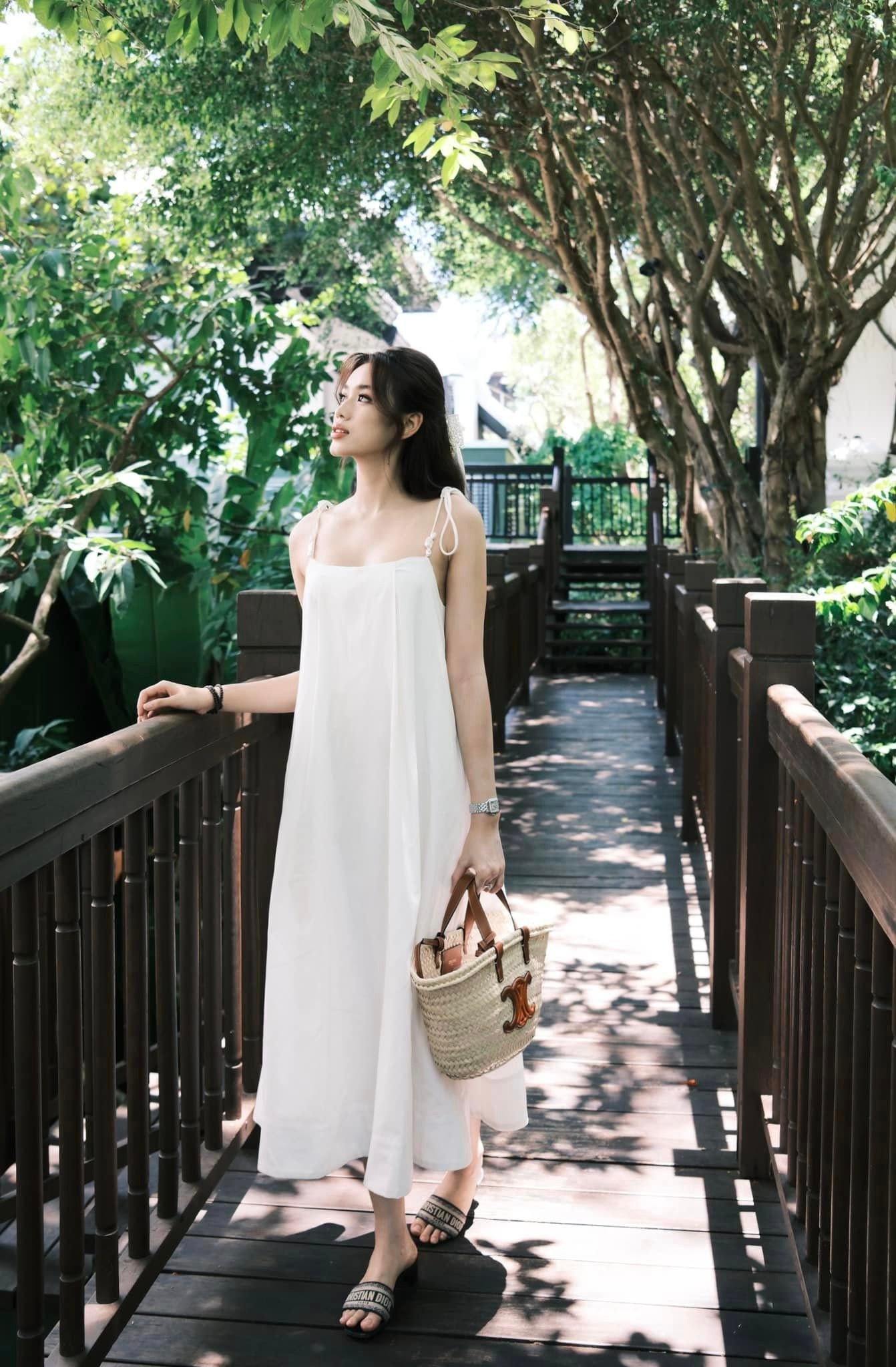 Nhìn lại những lần đi du lịch trước đây, nàng hậu thường ưa chuộng những mẫu váy suông rộng mát mẻ và có chi tiết điệu đà nữ tính. Như bộ váy trắng mà Hoa hậu Đỗ Thị Hà mặc khi nghỉ dưỡng ở Đà Nẵng được khen dịu dàng, dễ thương.