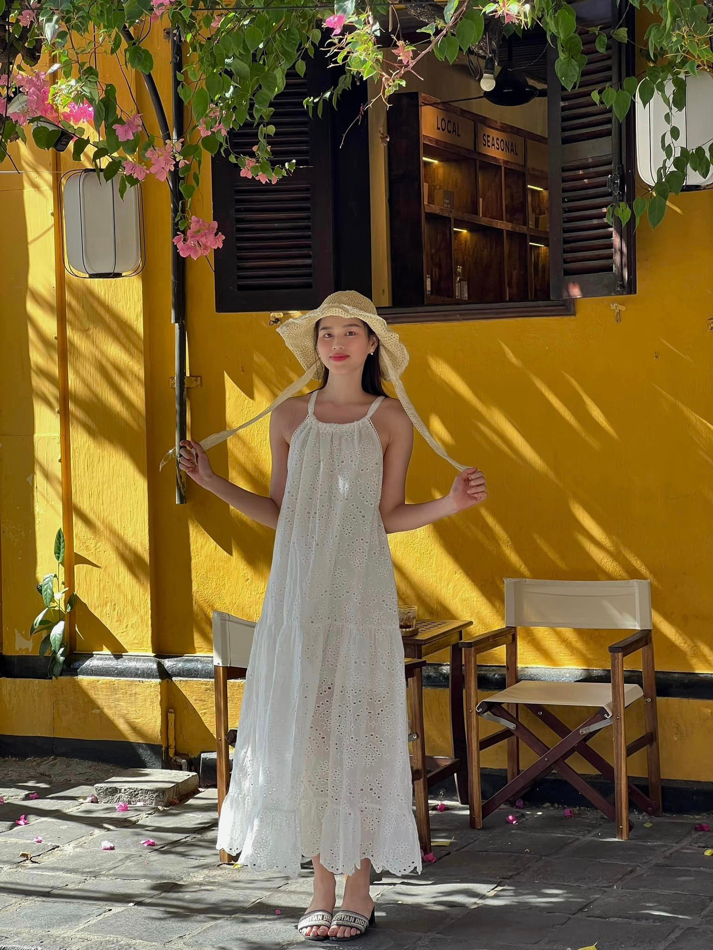 Trước đó, nàng hậu có lần mặc một thiết kế tương tự, cũng là váy hai dây dáng suông khi đi dạo phố cổ Hội An. Có thể thấy Hoa hậu Đỗ Thị Hà rất thích trang phục đơn sắc, có những tông màu nhẹ nhàng mang đậm hình ảnh nàng thơ.