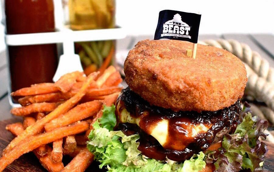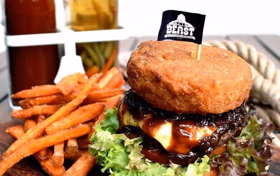 Bạn sẽ không phải hối hận khi lựa chọn dừng chân tại nhà hàng The Beast để thưởng thức món hamburger với những miếng thịt bò BBQ kẹp giữa các loại cheese đầy "quyến rũ" có giá tầm 22 đô cho 1 phần ăn, ăn kèm khoai lang ngọt.