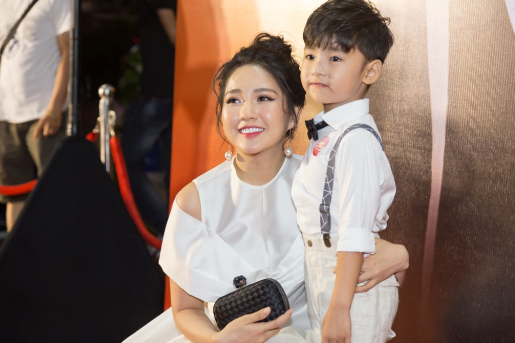Trịnh Thăng Bình bên cạnh mẹ và hai diễn viên nhí Chu Diệp Anh và Coca Hoàng Gia Bảo.