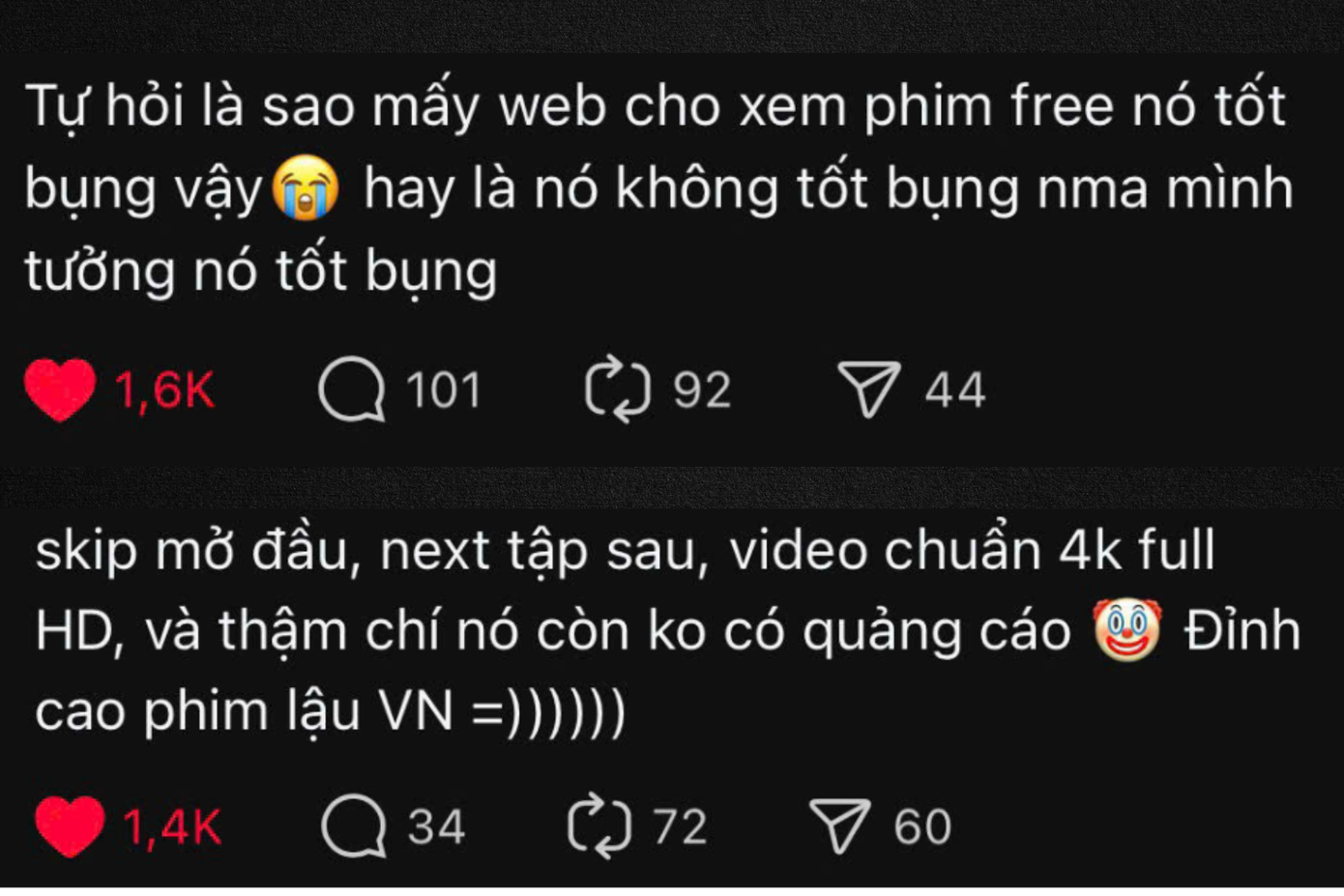 Gần đây, trên nền tảng Threads xuất hiện một số bài viết liệt kê lý do họ thích xem phim trên "web lậu" hơn là các nền tảng cung cấp phim chính thống. Ngay lập tức, dân mạng đã nổ ra một cuộc tranh cãi lớn.