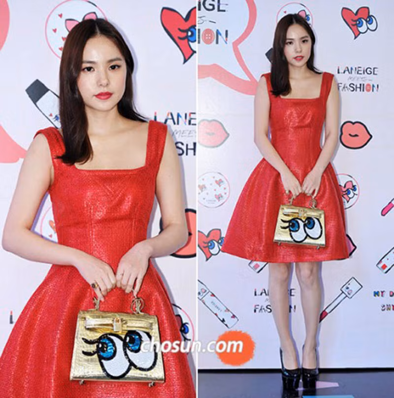 Chiếc túi xách Shy Girl của hãng Playnomore là điểm nhấn trong set đồ đỏ rực của nàng mẫu. Vì chiều cao chỉ dừng lại ở 1m60 nên “người bạn đồng hành” không bao giờ vắng mặt của Hyo Rin chính là đôi cao gót có vẻ khá “chông chênh”.
