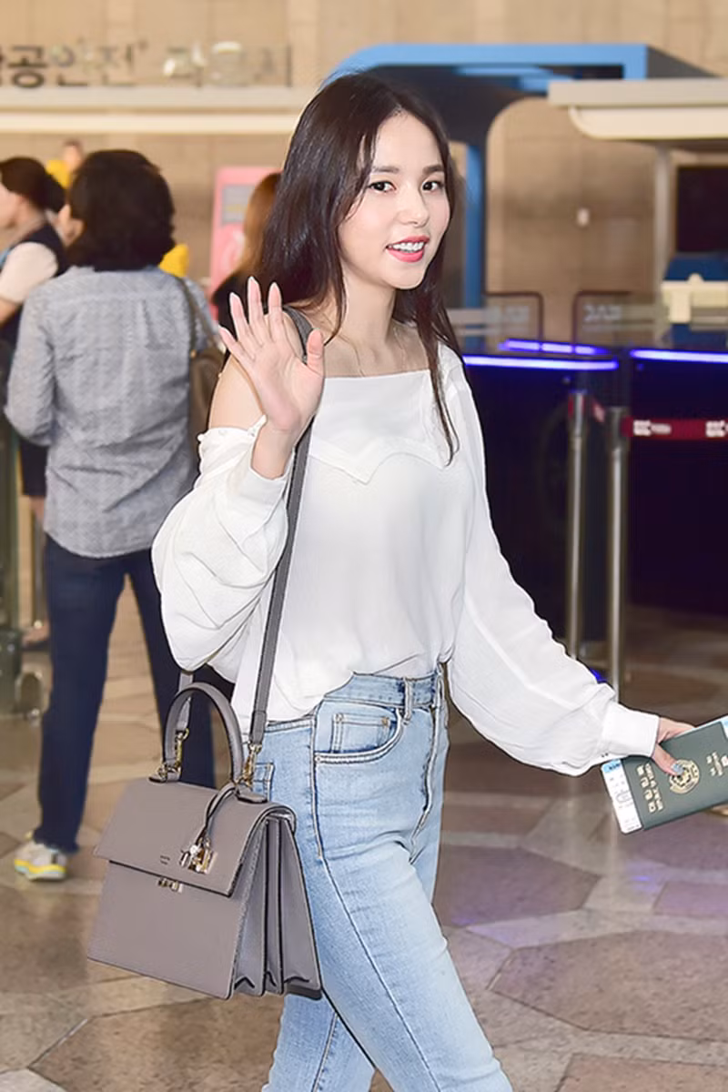 Style sân bay của Min Hyo Rin luôn kín đáo và trung tính. Túi xách Eva của Samantha Thavasa và Jacket Denim với tông màu pastel khiến người đẹp trở nên duyên dáng vô cùng.