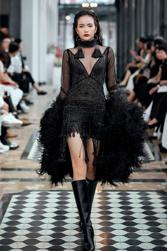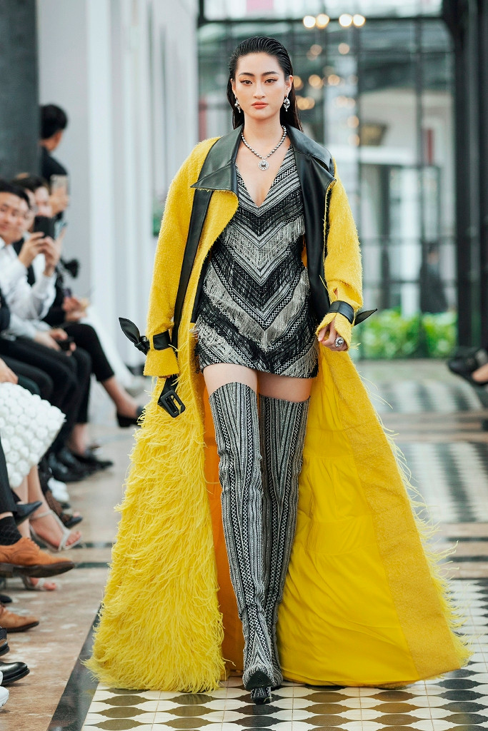 Hoa hậu Lương Thùy Linh gây bất ngờ khi xuất hiện trong vai trò first face cho show diễn lần này. Diện thiết kế váy đen họa tiết đậm chất núi rừng Tây Bắc kết hợp cùng áo khoác ngoài cầu kỳ, Hoa hậu Thế giới Việt Nam 2019 tự tin sải bước trong sự cổ vũ của các khách mời. So với thời điểm mới đăng quang, kỹ năng catwalk của người đẹp có sự tiến bộ rõ rệt. Đặc biệt, thần thái của chân dài sinh năm 2000 được mọi người khen ngợi.