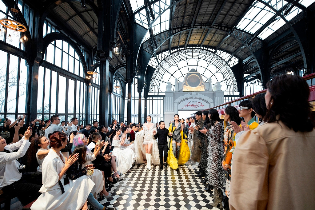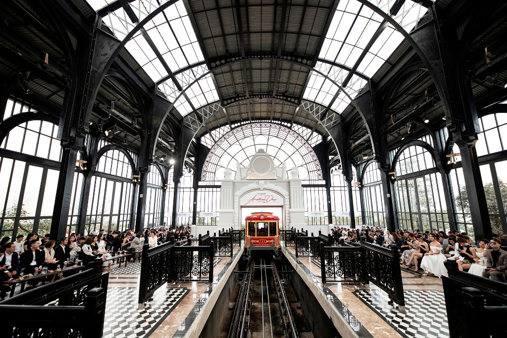 Từ khách sạn năm sao Hotel De La Coupole - M-Gallery Sa Pa có đường bộ đi thẳng đến nhà ga. Sau khi khám phá vẻ đẹp sang trọng, cổ điển của công trình, các khách mời lên toa tàu, di chuyển thêm khoảng 2km để đến điểm diễn. Tại điểm dừng cuối cùng, sàn catwalk và ghế ngồi chuẩn bị sẵn sàng. Bữa tiệc thời trang nhiều màu sắc bắt đầu. Ê-kíp tổ chức chương trình cho biết không thay đổi quá nhiều địa điểm sẵn có. Bởi vốn công trình là một “tác phẩm” kiến trúc nghệ thuật của “ông hoàng resort” Bill Bensley. Nhà ga mang phong cách kiến trúc cổ điển, lãng mạn đặc trưng của châu Âu với mái vòm, cột dầm đối xứng kiểu gothic. Xen lẫn hệ cột là dàn nội thất kính đón ánh sáng tự nhiên và mở rộng tầm nhìn ra khung cảnh núi rừng. Đặc biệt, ánh sáng tự nhiên được tận dụng cho show diễn.