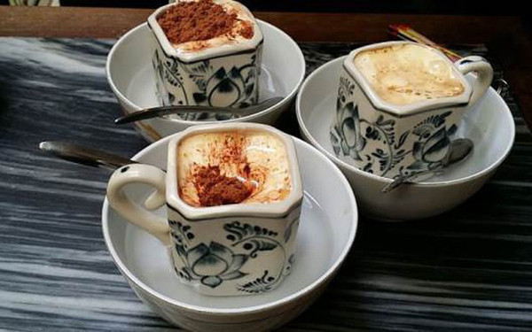 Tách cà phê trứng và cacao trứng cũng được đặt trong bát nước nóng để giữ ấm cho đồ uống giống như cách phục vụ tại Hà Nội. Giá mỗi tách cà phê trứng ở Nhật Bản là 480 yen/ ly (tương đương khoảng 100.000 đồng). Còn tại Hà Nội, giá mỗi tách cà phê trứng là 25.000 đồng/ ly.