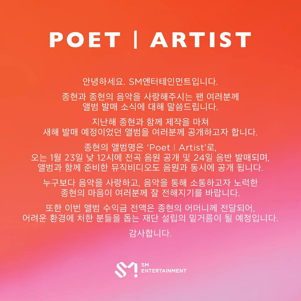 Dù rất đau lòng nhưng mong mỏi của đông đảo người hâm mộ đã được SM Entertainment chấp thuận. Album cuối cùng của Jonghyun sẽ đến tay người hâm mộ như món quà chào tạm biệt mà nam ca sĩ tài hoa bạc mệnh muốn gửi gắm. Thế nhưng, bạn có tự hỏi vì sao SM Entertainment lại chọn "Poet | Artist" làm tên chính thức cho album vô cùng ý nghĩa như thế này không?