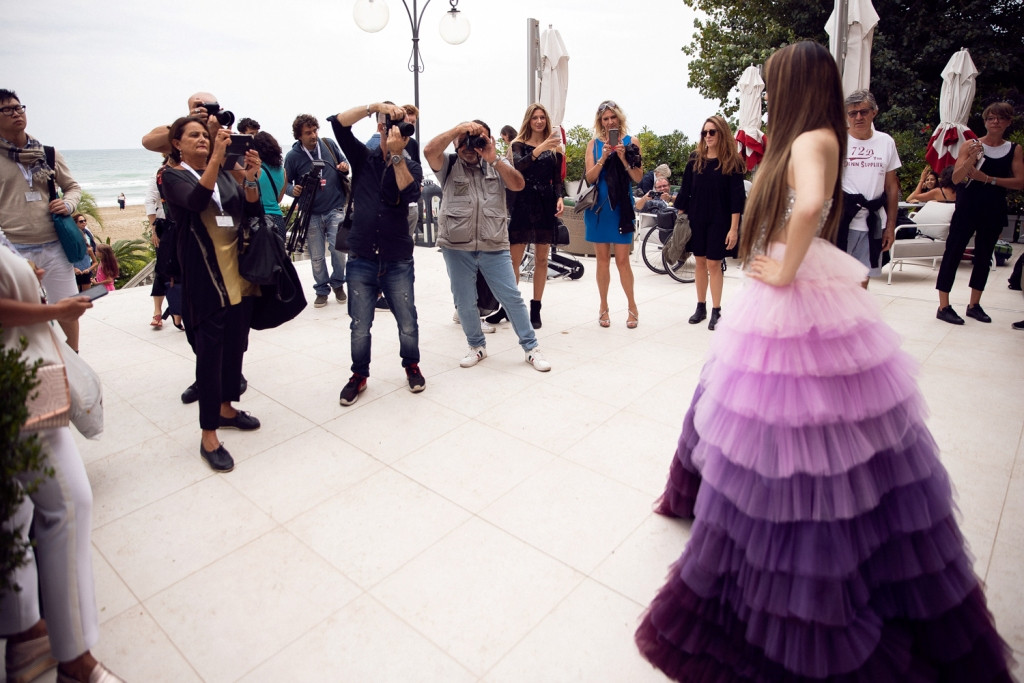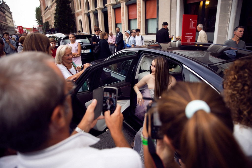Vừa có chuyến công du thành công đầu tiên sang Rumani đã phải sắp xếp lịch trình bay sang Ý cùng ê-kíp để ủng hộ "gà cưng" tranh giải Sư tử vàng, Lý Nhã Kỳ vẫn vô cùng rạng rỡ trong trang phục lộng lẫy của nhà thiết kế Đỗ Long, thu hút mọi ống kính của các nhiếp ảnh gia quốc tế.