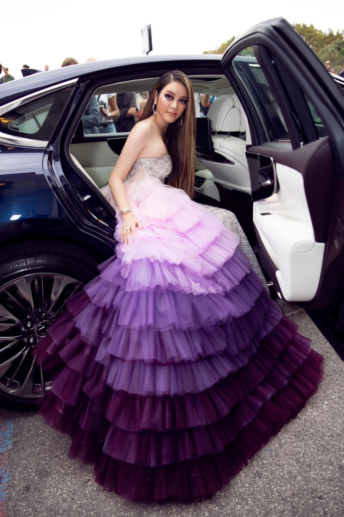 Chọn cho mình bộ đầm đính hàng ngàn viên pha lê với kỹ thuật may cao cấp nhất, phần tùng váy ombre chuyển màu tím nhạt sang đậm tinh tế, người đẹp họ Lý đã thu hút sự chú ý của các ống kính nhiếp ảnh quốc tế.