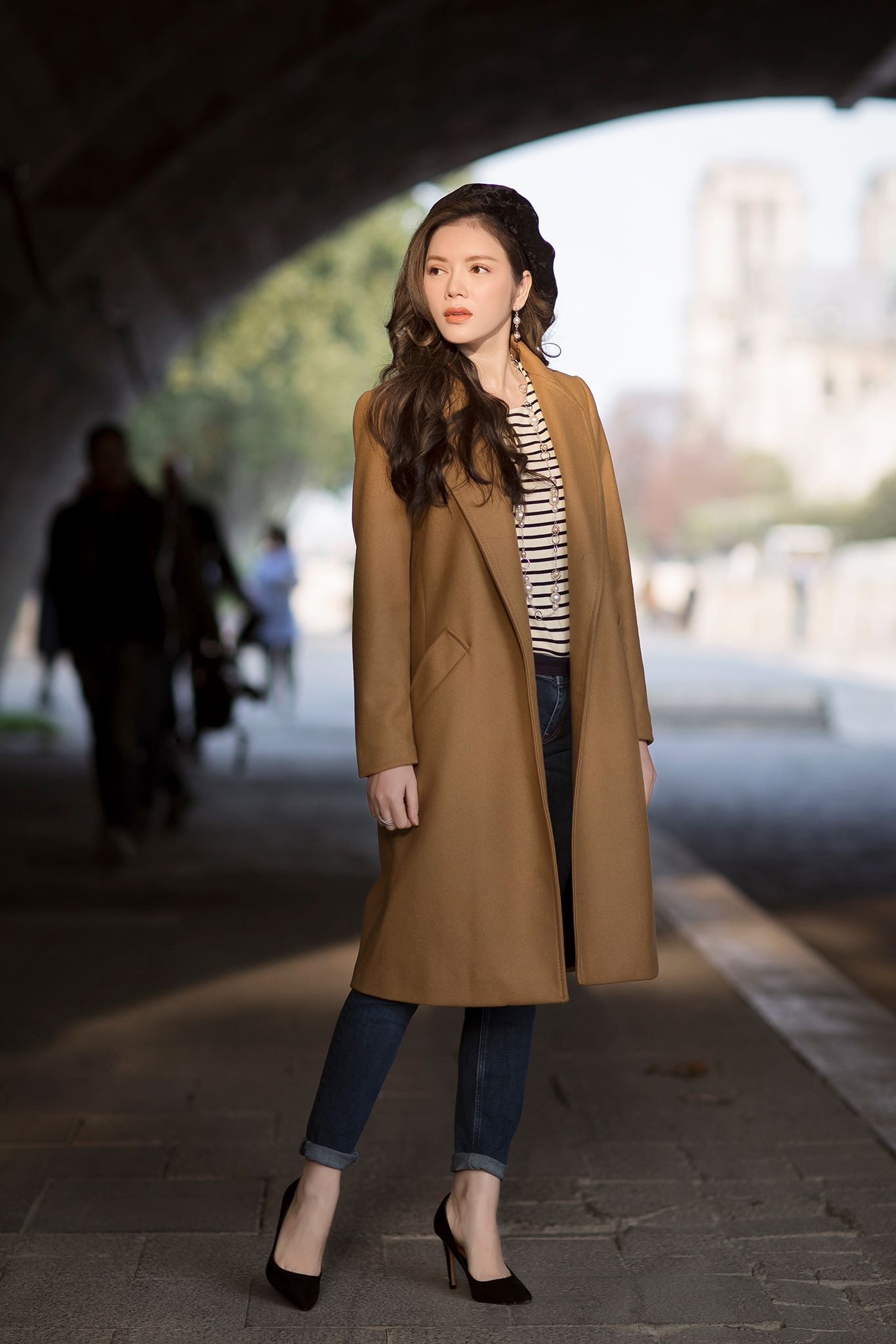 Với áo khoác ngoài tinh tế cùng mẫu áo thun kẻ sọc và quần jeans, Lý Nhã Kỳ toát lên vẻ đẹp đậm chất Pháp.