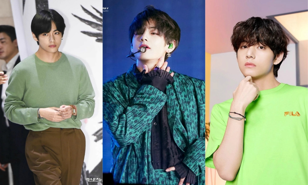 Xanh lá mạ thì dễ mặc rồi, nhưng gam xanh lá cây thực sự không phải ai cũng mặc được, nếu không cẩn thận sẽ khiến da bị xỉn màu và trông bị già. Nhưng V thì sao, có ai thấy gam xanh lá làm "khó" được nhan sắc của V không?