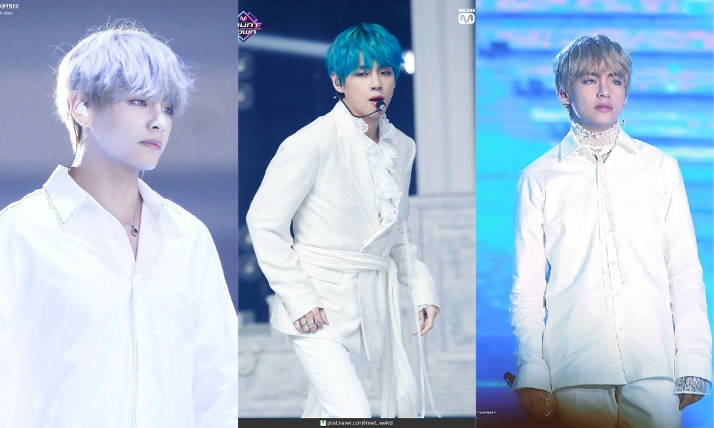 Gam màu khó chơi nhất đây, không phải ai cũng dám mặc, nhất là phái nam. Nhưng cho dù là tông tím đậm hay tím nhạt thì cũng chẳng "xi nhê" gì với V hết, vẫn không thể "dìm" được nhan sắc của anh chàng bớt đi tí ti nào. Thậm chí V còn làm cho màu tím trông đẹp hơn rất nhiều luôn ấy!