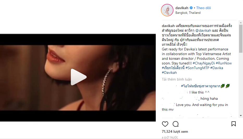 Đến lúc này các fan mới hiểu một phần dòng chữ Thái #เรียกใช้เดี๋ยวนี้ (Chạy ngay đi) mà Sơn Tùng từng đăng kèm. Với dòng hashtag Davika, danh tính bạn diễn của nam ca sĩ đã được hé lộ. Không ai khác chính là nữ minh tinh xinh đẹp đến từ xứ sở chùa Vàng Mai Davika, cô được mệnh danh là "ma nữ" đẹp nhất Thái Lan thông qua bộ phim Tình người duyên ma đóng cặp với tài tử điển trai Mario Maurer.