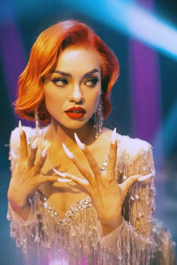 Bên cạnh đó, Á quân The Face Vietnam 2016 cũng gây ấn tượng với vóc dáng nuột nà, đường cong cơ thể quyến rũ và phong thái tự tin. Mái tóc ngắn màu cam nổi bật được uốn xoăn ngắn cổ điển tôn lên gương mặt mang nét đẹp hiện đại của cô.