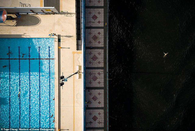Tugo Cheng chụp cảng Victoria của Hồng Kông. Trong ảnh là một số người đang bơi trong bể bơi, còn một số người khác, đặc biệt người lớn tuổi, thấy tự do hơn khi bơi trên biển.