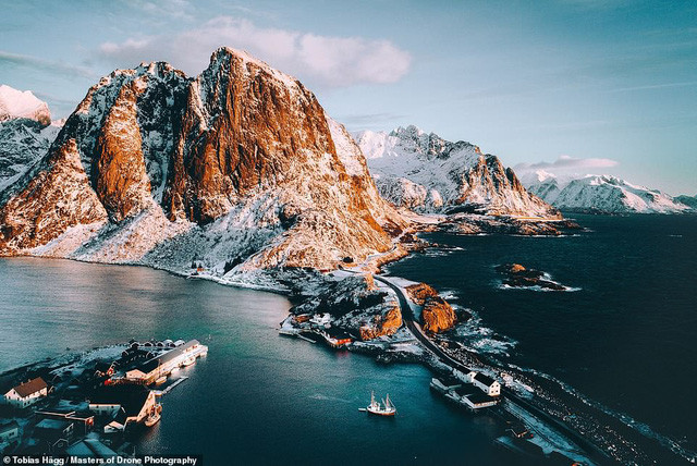Tobias Hagg chụp bức ảnh này lúc bình minh, máy bay của ông bay phía trên ngôi làng nhỏ Reine ở quần đảo Lofoten, phía bắc Na Uy. Ông nói, vào mùa Đông ở Bắc cực, bạn “sẽ có hàng giờ nắng vàng, tức là bạn sẽ có nhiều cơ hội hơn để chụp các bức ảnh núi hoàn hảo về ánh sáng và sống động về màu sắc”. Theo ông, Lofoten nổi tiếng về màu nước xanh giống như nước biển Caribbean.
