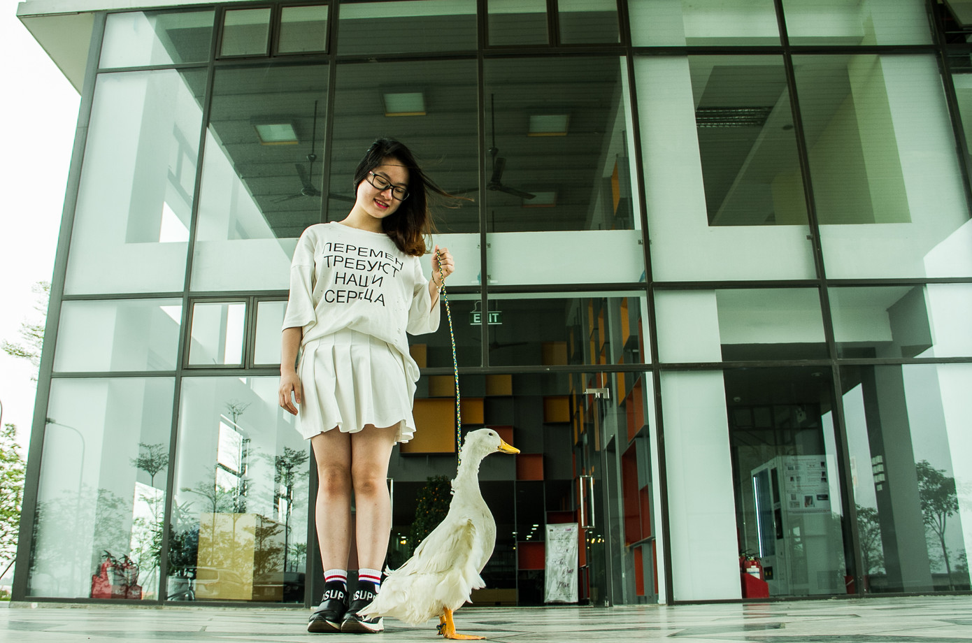Cùng vịt tạo dáng trước tòa giảng đường và các tòa kí túc xá, không gian rộng gần 30 ha của ĐH FPT tạo phông nền cực mênh mông cho hai "mẫu ảnh".