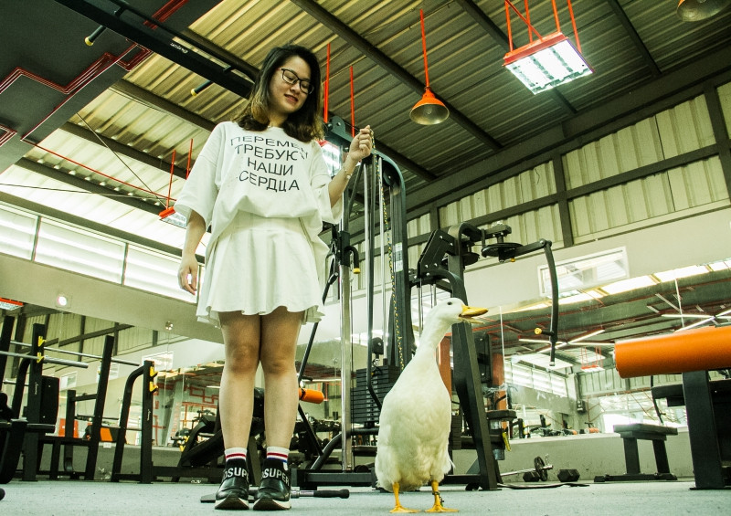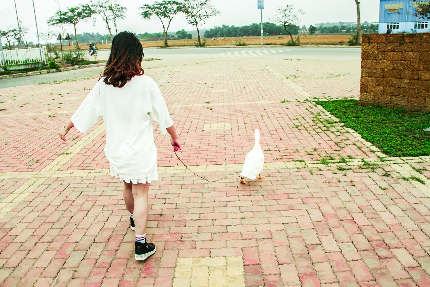 Đi tập thể dục cũng cho vịt đi theo, em ấy không rụng nhiều lông như chó mèo nên đưa vào nhà không cần phải lo lắng quá nhiều.