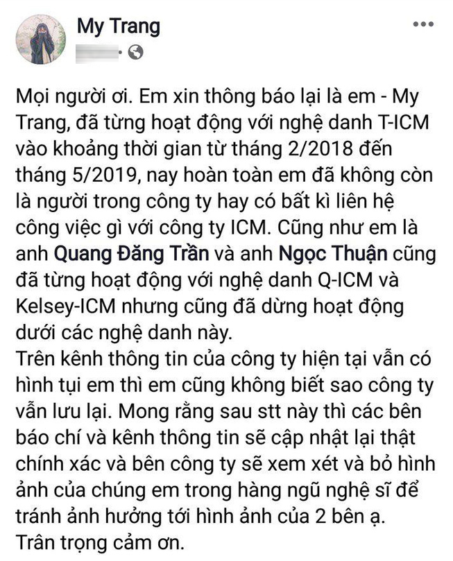 Dành một phút “update” nhanh cho những ai chưa kịp theo dõi biểu đổ drama đang phát triển mạnh mẽ thì sau loạt tin tức về việc công ty quản lý Jack bóc lột sức lao động, vắt kiệt sáng tạo của anh trong 1 năm qua (tổng cộng 8 bài hát ra mắt trong 2019), đã có những lời đăng đàn “không muốn liên quan” của các nghệ sĩ từng trực thuộc công ty như: My Trang (nghệ danh cũ: T-ICM), Quang Đăng (Q-ICM) và Ngọc Thuận (Kelsey-ICM) xuất hiện, tình hình càng trở nên phức tạp khi trang cá nhân của K-ICM đột ngột “đóng cửa”, website công ty “bốc hơi”, nhiều fan thậm chí còn lên tiếng đòi công bằng cho Jack bằng cách huỷ đăng ký kênh Youtube K-ICM.